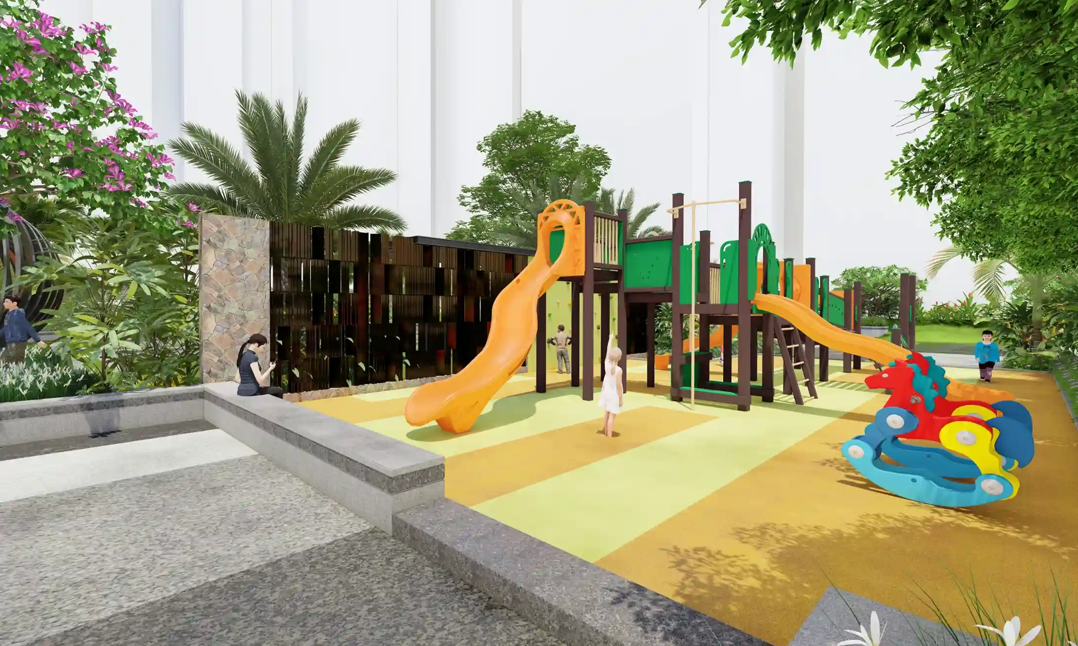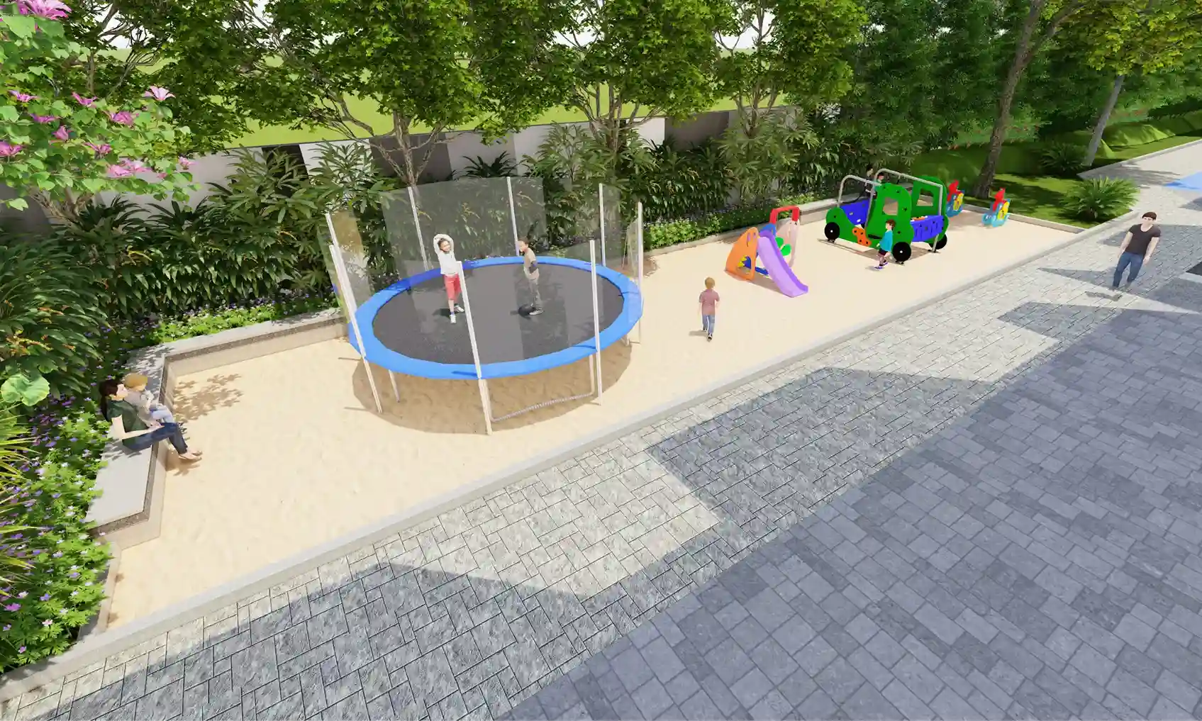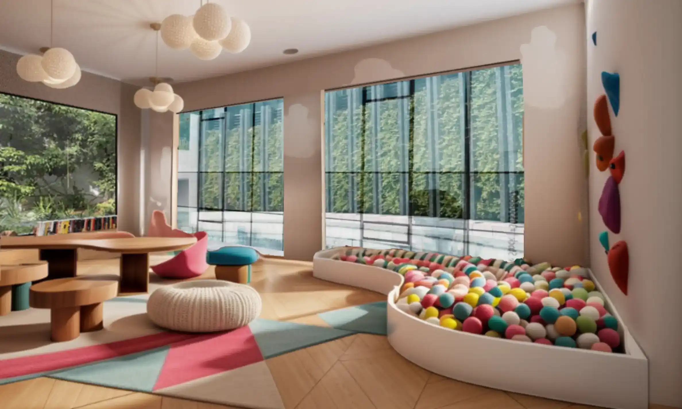 Experience a zero-vehicle ground level, designed for peace and safety. Featuring engaging play areas like life-sized chess, colorful hopscotch, and a maze—providing a secure, vibrant space for children to explore freely without the worry of traffic.